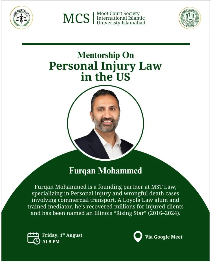 Furqan was invited by the Moot Court Society of the International Islamic University, Islamabad to deliver a guest lecture on U.S. personal injury law. The session covered key topics including negligence principles, insurance policy structures, and the litigation process from initial claim to resolution.